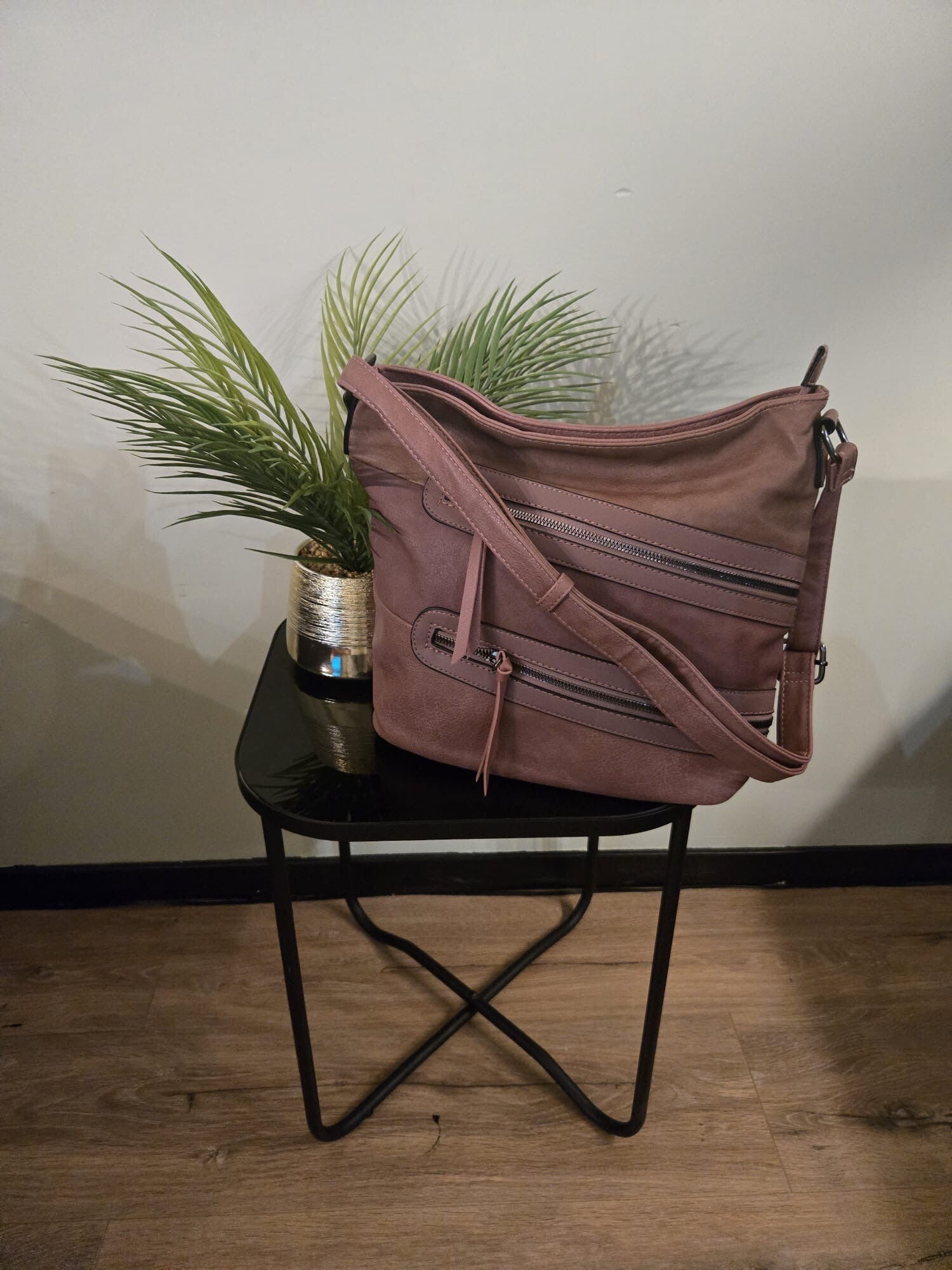 Schoudertas met ritsen bruin/zalm 030
